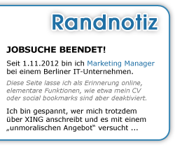 | Sie möchten mal gerne live sehen, was ich "wirklich drauf" habe? Laden Sie mich doch zu einem Vorstellungsgespräch/ AC ein! Morgen? Übermorgen? In 3 Wochen? Einen passenden Termin können Sie einfach in meinen Kalender eintragen ... |